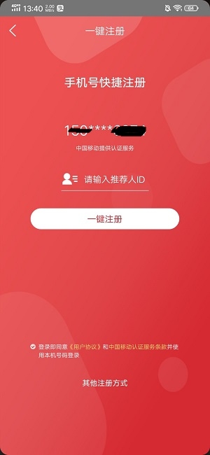2、点击之后进入软件登录界面,点击界面上的“立即注册”,如果用户是手机打开的软件可以选择一键注册选项,填写邀请人ID即可进行注册;