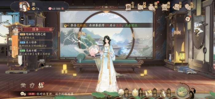 礼物主要来自,“名士”支线、元宝+铜钱商店、游赏、寻宝、成就。铜钱商店不再赘述。游赏每日25分钟拉满。寻宝图碎片主要来自社团任务、团员交换。