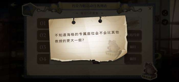 哈利波特魔法觉醒巧克力蛙在哪?哈利波特魔法觉醒的每日任务完成后都能获得一些不错的奖励,这次的每日任务需要玩家去寻找巧克力蛙,线索需要玩家去找海格。那么巧克力蛙任务怎么做呢?让我们一起来看看吧。