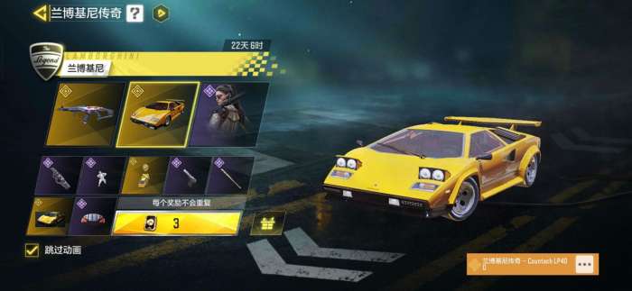 通体亮黄的车身颜色引人夺目,让驾驶兰博基尼传奇-Countach LP400的战士不论身处黑色战域,还是边境战场,都能成为经典传奇的继承者。
