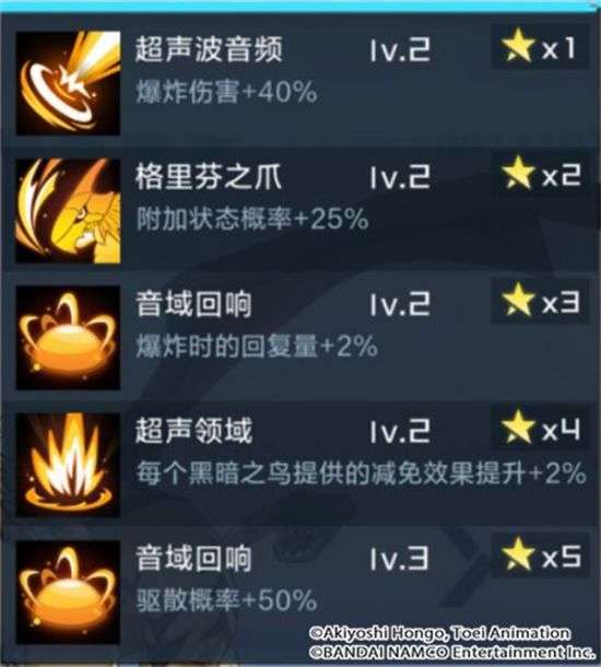 攻击全体敌人,对每个目标各造成一定伤害,并有概率使用音符为目标添加黑暗之鸟。被黑暗之鸟附着的目标再次受到狮鹫兽的攻击时,将会使黑暗之鸟发生爆炸,造成相当于狮鹫兽一定百分比防御力的伤害。