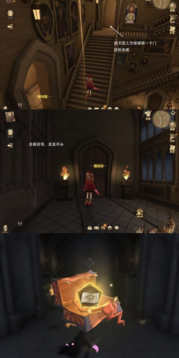 1.城堡主楼,图书馆上方楼梯到达走廊→进入走廊拐弯走到尽头→进入盥洗室,触发剧情,奖励:图书馆券*1
