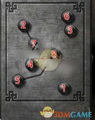31、点击右边的小柜子放上小钢珠,查看卧室照片墙,按下图顺序点击获得钥匙。