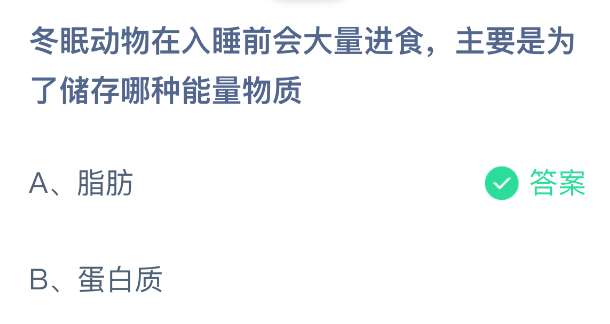 3、答案解析:冬眠动物在入睡前大量进食,主要是为了储存脂肪。脂肪是动物体内最高效的储能物质,单位质量所含能量远高于糖类或蛋白质,非常适合为漫长而低代谢的冬眠期提供持续能量。同时,脂肪层还具有保温、缓冲和减少摩擦的生理功能,能帮助动物抵御寒冷和减少能量损耗。
