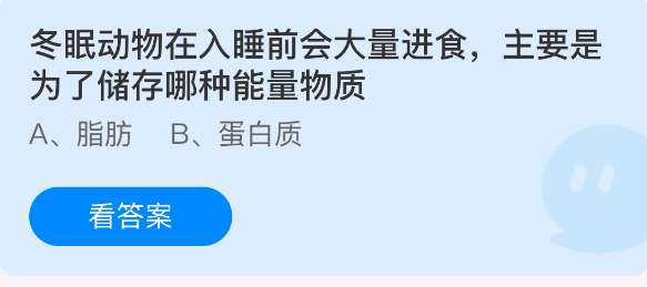 冬眠动物在入睡前会大量进食,主要是为了储存哪种能量物质?支付宝小鸡课堂开课啦!每天花一分钟答题赚饲料,喂喂小鸡就能贡献爱心啦!轻松又意义十足!2026年2月9日蚂蚁庄园的小鸡课堂题目正确答案是【脂肪】,冬眠动物在入睡前大量进食,主要是为了储存脂肪。