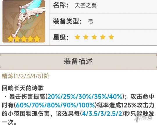 天空之翼的副词条可以增加22.1%的暴击率,减轻角色装备圣遗物的压力,适合所有以攻击力为主要影响因素的主DPS角色。