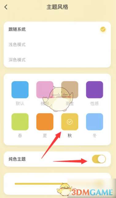 3、进入主题风格页面,点击开启【纯色主题】右侧的开关,即可完成本次操作。