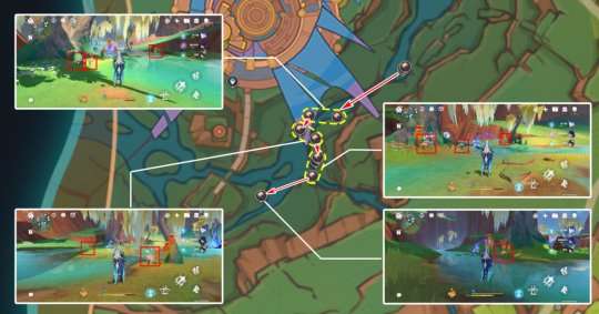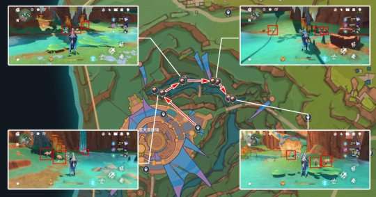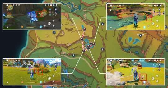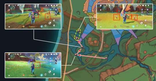 ◆从柴薪之丘山顶传送点出发,所有采集点均在柴薪之丘山顶的池塘边,沿着下图路线行进即可。