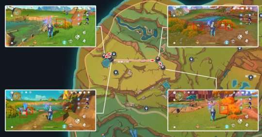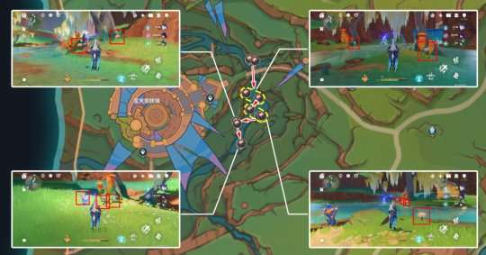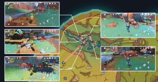 ◆柴薪之丘北方营地附近,所有采集点均在营地内巨大的植物附近。注意左上图采集点远离两处巨大植物。