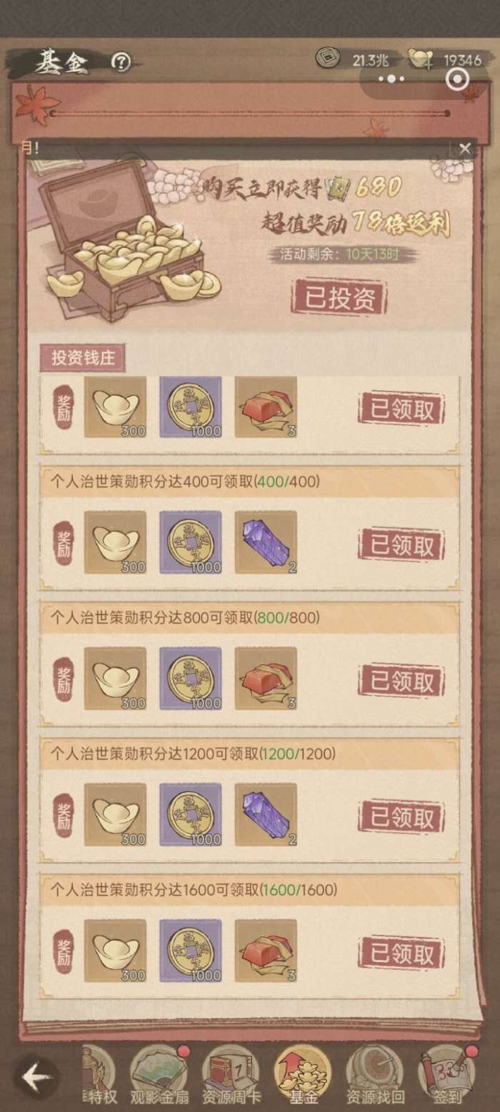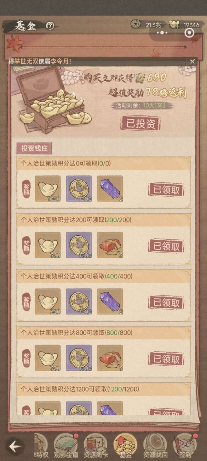 基金直接给11000通宝,能帮你少花很多功夫攒招募券,不用再为抽不到心仪的僚属犯愁,长期玩的话,这点通宝真的太关键了。