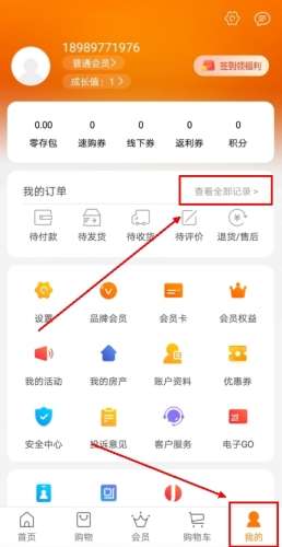 1、先进入【我的】界面,找到我的订单,并点击右侧【查看全部记录】;