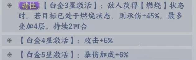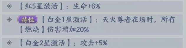 天火尊者的强度成长高度依赖技能等级与星级突破。升至红四星后,其普攻将拥有60%概率直接附加【燃烧】状态,大幅提升挂dot效率;晋升白金一星时,天赋激活【燃烧增伤】效果——全队由天火尊者触发的燃烧伤害提升20%,进一步夯实其作为灼烧体系核心的地位。该特性决定了其阵容适配路径高度垂直:必须构建以火属性为主、专注燃烧覆盖率与持续伤害转化的专属队伍。