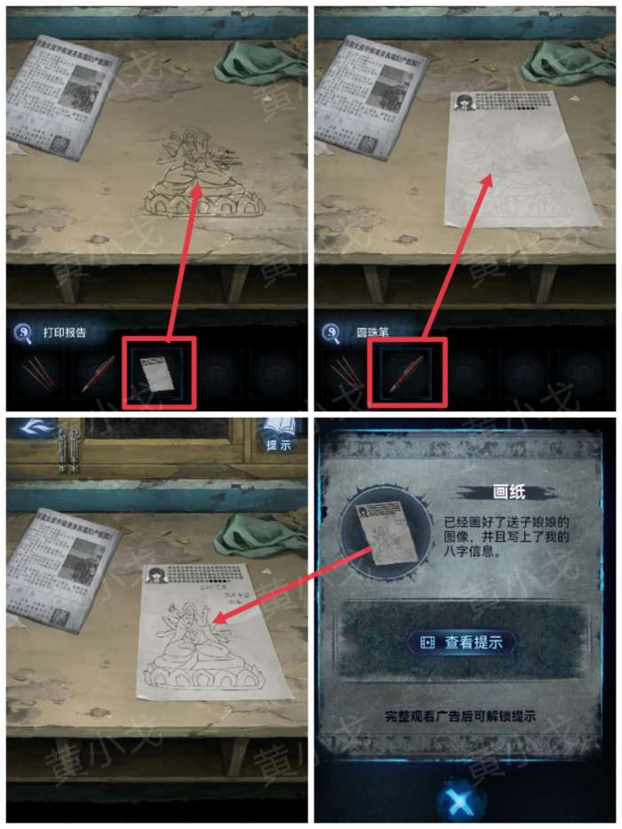 25.点击桌子,把【打印报告】放到刻痕画上,用【圆珠笔】描痕,写上生辰八字,获得【画纸】(有小高能?)