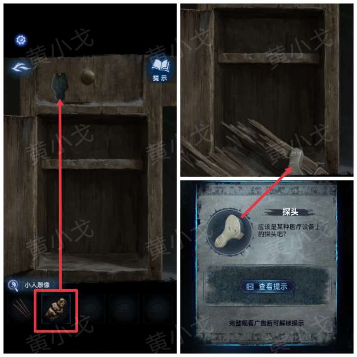 16.点击桌子的抽屉,把【小人雕像】放入人形凹槽中;打开抽屉,获得【探头】