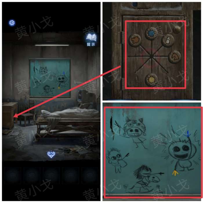 5.点击桌子的柜子上的密码锁,根据滑块上的图案,结合涂鸦上的线索,调整对应滑块的位置