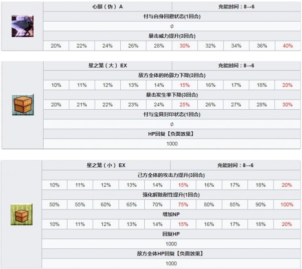 敌方全体的防御力下降(3回合),暴击发生率下降(3回合),付与宝具封印状态(1回合),HP回复【负面效果】