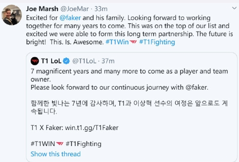 随后T1老板Joe Marsh转发了该消息,并称:为“Faker和他的大家庭”而感到兴奋,期待着在未来的许多年里一起工作。共同来建立长期合作伙伴关系这是我们的首要任务并为此感到激动。未来无比光明,这真的是太棒了!