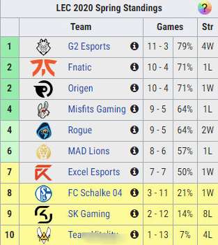 LCS的C9虽然连胜被终结,但早已提前进入季后赛,以常规赛第一进入季后赛也没什么压力,而目前LEC赛区的榜首位置竞争却是相当激烈。