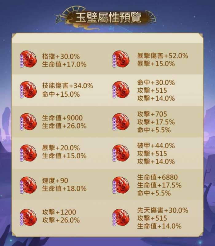 注:玉璧为在前期属于铜钱绞肉机,花费巨量铜钱,但提升的属性确实随机的,因此请在准备好足够的铜钱和玉髓时再冲击目标的红色4星法宝,否则升级后有可能是负提升。(含有格挡、命中词条的玉璧目前用处较少,不推荐使用)