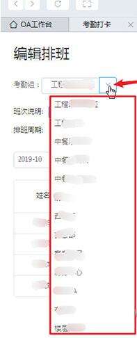5、选好日期后,便把鼠标移动到上方的“考勤组“向下箭头处,就会弹出一个本公司的考勤组列表名称。注意,这个列表根据你的权限来决定,如果是管理员,可以看全公司的考勤组名称,如果只是考勤负责人,则只能看到负责的考勤组名称。这里是管理员的权限。