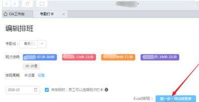 6、选择要导出的考勤组名称后,鼠标移动到“Excel排班”右边“第一步:导出排班表”上面,并点击。