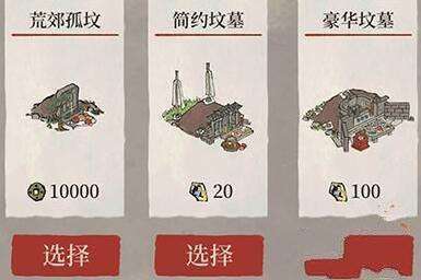 游戏后期玩家们会遇到居民死亡的情况,这时候玩家们就需要购买坟墓,坟墓分成三种有荒郊孤坟、简约坟墓、豪华坟墓三个,每个坟墓都有不同的价格,玩家们可以根据自己的实际情况选择适合的坟墓。