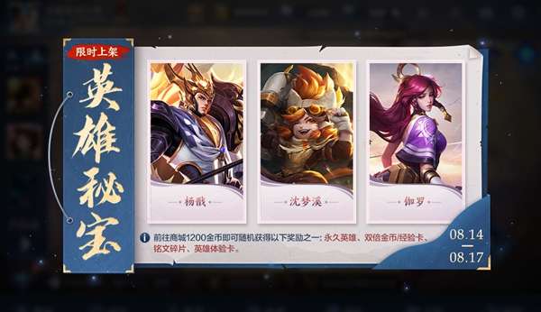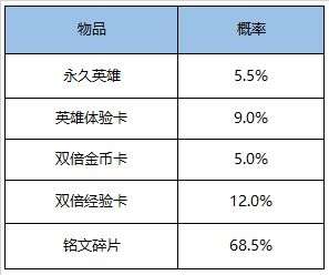 打开后可随机获得以下奖励之一:杨戬、沈梦溪、伽罗、英雄体验卡(3天)、双倍金币卡:1日、双倍经验卡:1日、188/138/108铭文碎片。