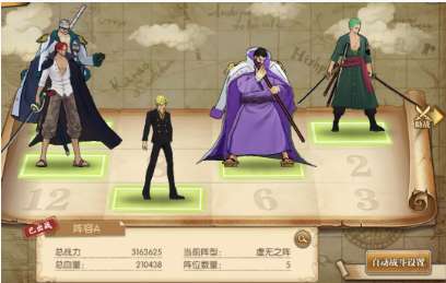 首推争霸之阵,这个阵简直是为伤害不足的荣耀赛量身定制的(尽管我没有但不妨碍我上图),效果如何就不用说了,站位选择一二号位新世界乔巴(回血断技能)新世界弗兰奇(吸收伤害),八号位和十一号位藤虎和新世界布鲁克自由选择,避免直接对位,十二号位卡塔库栗凭锁血可以直面对位。