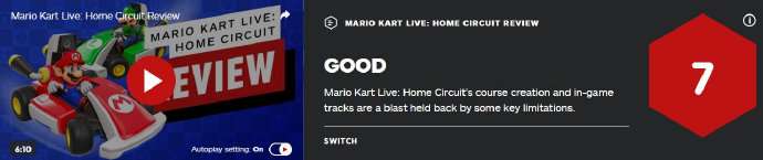 【IGN评《马里奥赛车》AR新作7分 技术限制了本作的发挥】IGN为任天堂的《马里奥赛车真实版:家庭巡回赛》给出了7分的评价,他们认为AR技术与《马里奥赛车》的融合非常棒,当你有足够的空间和动力来让自己的赛车路线变得更加多样化和巨大后,你就能充分发挥本作与现实结合的新颖性。在赛道上急驶的感觉让人倍感快乐和新颖——但是这一切都建立在平稳运行的前提下,很多时候,本作出现的各种技术问题会使得香蕉皮泛滥成灾(使操控变得更加困难)