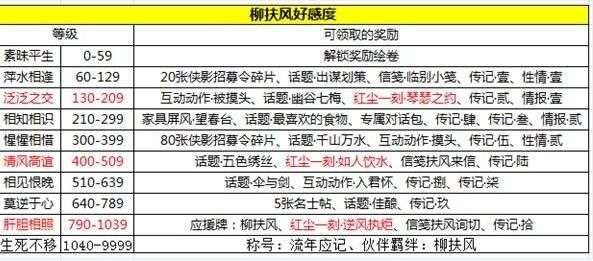 2、在这里我把每一等级的好感度奖励为大家列出,我们可以看到,如果要进行柳扶风的天命任务,就需要完成和伙伴的红尘一刻,红尘一刻是通过柳扶风的好感度提升才可以进行的。
