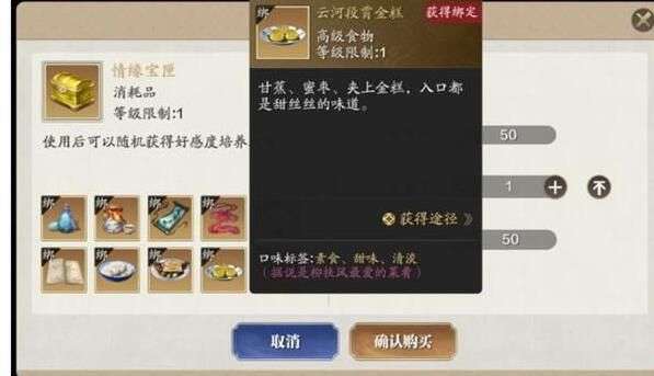3、柳扶风好感度提升方式,柳扶风的最爱:云河段霄金糕(情缘宝箱开出,几率较低)。