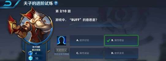 在王者荣耀手游中,夫子的进阶试炼问题:游戏中,“BUFF”的意思是?