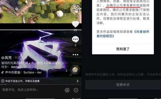 近期有不少用户向我们反馈,自己在抖音发布的非腾讯游戏视频被腾讯投诉下架,其中包括Dota2、魔兽世界等著名游戏。
