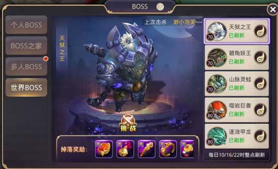 1、世界BOSS每天10/16/22时整点刷新,玩家可前往挑战。