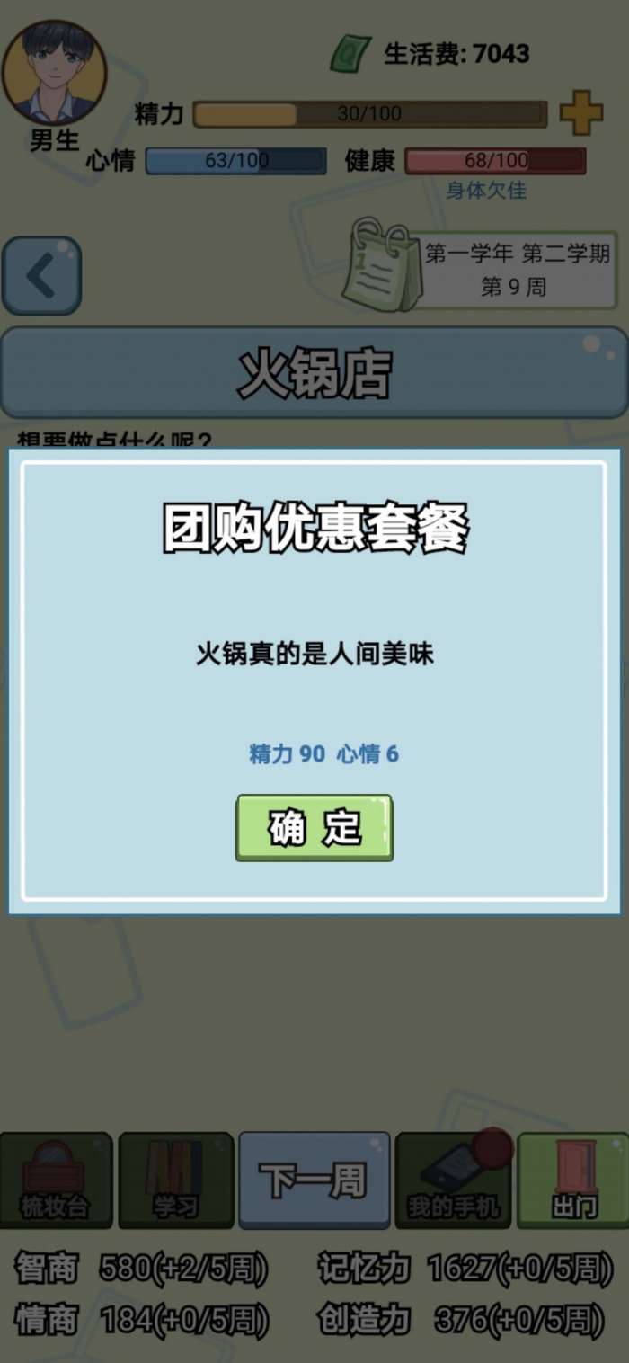 3.学习掉心情和健康特别快,哪怕后期一直刷都刷不上去,数值不太合理。100的心情和健康,满学习三个星期就全掉光了,后面十几周再锻炼都恢复不到及格,所以恢复心情和健康变得可有可无,反正稍微学习慢点也没啥,恢复心情健康那才叫慢。