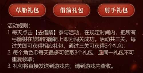 三个关卡分别对应【草船礼包】、【借箭礼包】和【射手礼包】三个福利礼包,每通过一关可领取对应礼包,全部通关即可将三个礼包统统收入囊中。若是操作失误,可从当前失败关卡重新开始。草船借箭,谁能满载而归?赶快叫上你的好友一起来接受挑战吧!