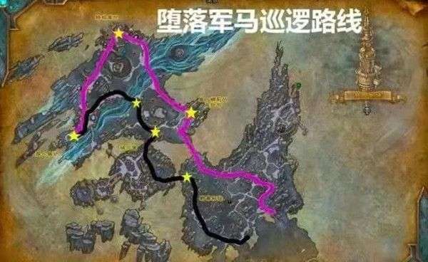 军马跑得很快,一般的坐骑根本追不上,最佳的方式是确定路线后,在中途围堵。上图的紫色和黑色线,就是“堕落军马”前往刻希亚的两条固定路线。刷新后地图上会有星星的标记,以此能判断稀有怪的实际奔跑路线,如果中途没有玩家干扰,“堕落军马”到达刻希亚的整个过程大概在4分钟左右,时间上来说足够玩家赶往目的地。