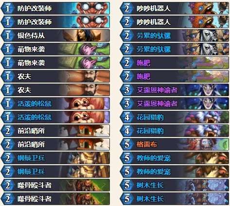 卡组适合平民、想上分和快攻玩家。起手可留钢鬃卫兵、农夫、活泼的松鼠、前沿哨所。