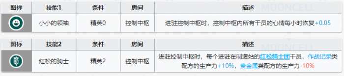 (精英2)进驻控制中枢时,每个进驻在制造站的 红松骑士团* 干员,作战记录类配方的生产力+10%,贵金属类配方的生产力-10%