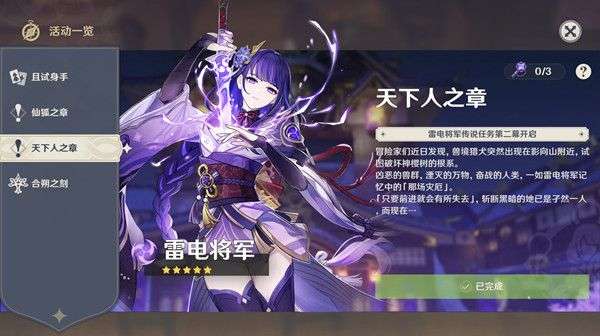 且完成雷电将军传说任务:天下人之章·第一幕「影照浮世风流」。