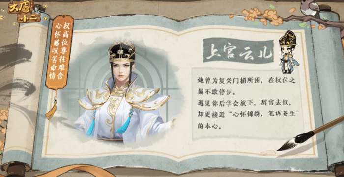上官云儿虽是女子,但却总是身着官服,眉间凝着霜雪,她曾经为了复兴门楣被困,为了提升家族的地位和名望,哪怕是在权力的巅峰也丝毫不敢停步,遇见了玩家之后才懂得放下。