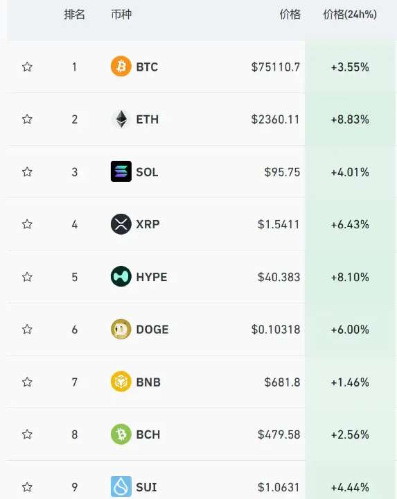 3月17日,加密货币市场集体大涨,比特币突破7.5万美元,日内涨幅超3%;以太坊突破2300美元,涨幅接近9%。SOL、XRP、狗狗币等同步走高。