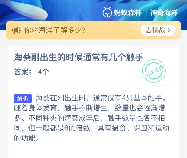 海葵刚出生的时候通常有几个触手?【神奇海洋】2026年3月31日新题目已开答!正确答案现已公布,点击领取拼图,一起为修复海洋生态贡献力量!今日正确答案是:【4个】。海葵在刚出生时,通常仅有4只基本触手。