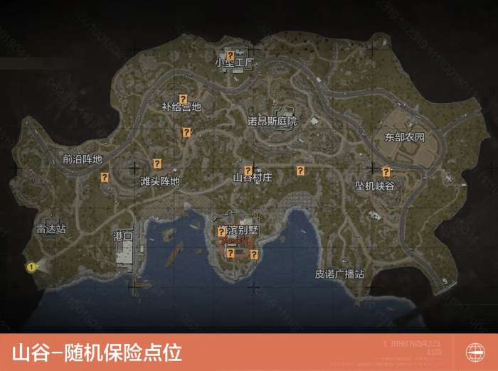 山谷地图中共有11处随机保险刷新点,分别位于小型工厂、补给营地、滩头阵地、山谷村庄、坠机峡谷、海滨别墅。
