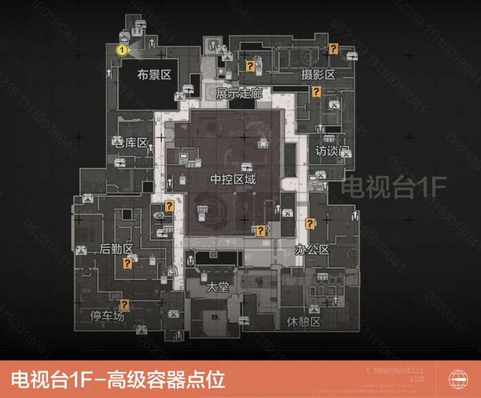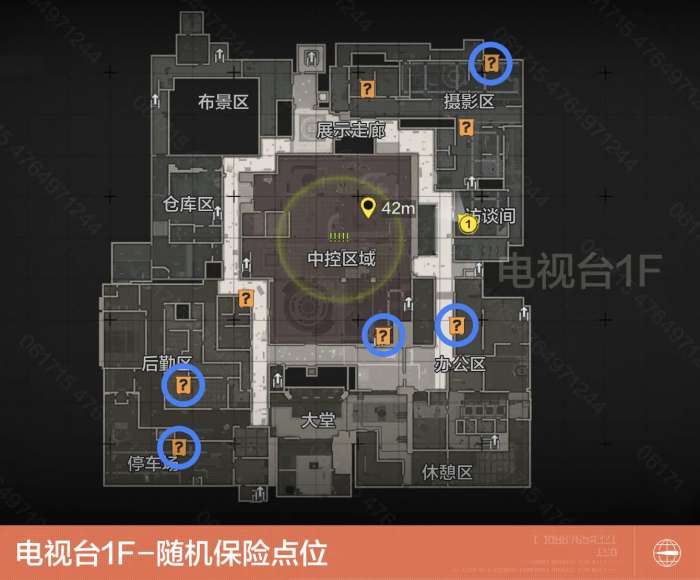电视台内部共有8处随机保险刷新点。在1F区域内有5处,分别位于停车场、后勤区-餐厅、中控区域-演播厅、办公区-第一制作部、摄影区-录影棚;在2F区域内有3处,分别位于控电室、录音室、临时医疗处。