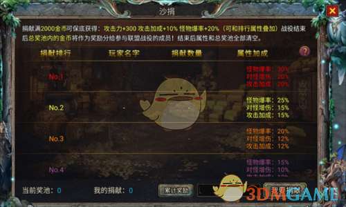 4、可拿2000金币去捐献榜捐献,不仅有高额的攻击加成更重要的是可提升打怪爆率,有什么能比打怪爆神装更爽快的事情呢。