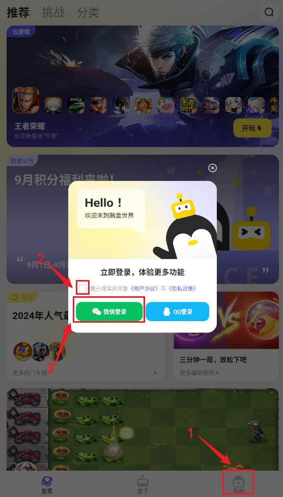 鹅盒app怎么用微信账号登录,下载并打开应用之后,会看到下图界面,点击我的就会弹出登录界面,这个时候,按照下图所示,勾选我已阅读并同意前面的选项之后,再点击微信登录即可。