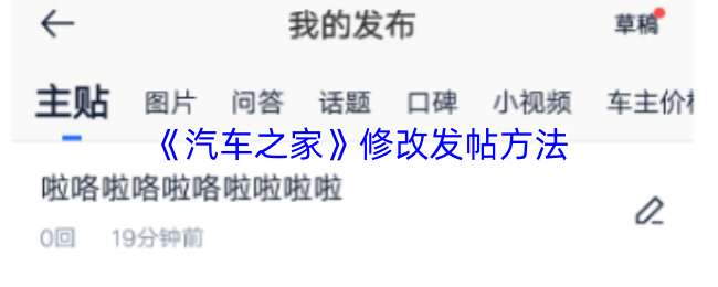 打开汽车之家APP并登录账号,点击右下角“我的”进入个人中心,找到“发布”选项点击进入,在发布列表里找到要修改的帖子,点击帖子标题后的笔图标进入“发帖”页面,对内容和标题修改后,点击右上角蓝字“发布”,等待页面出现“修改成功”提示框即可。
