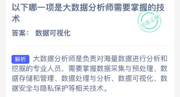 以下哪一项是大数据分析师需要掌握的技术?【蚂蚁新村每日一题】2026年1月17日题目已发布!坚持答题,积累木兰币,即可加速小镇建设。答对本题,立即可享“产速+3/时”的加速奖励!今天正确答案是【数据可视化】。数据可视化是大数据分析师需要掌握的技术。