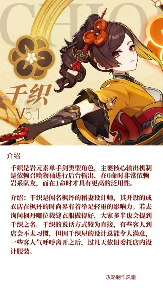 千织是岩元素单手剑类型角色,主要核心输出机制是依赖召唤物袖进行后台输出,在0命时非常依赖岩系队友,而在1命时才具有更高的泛用性。
